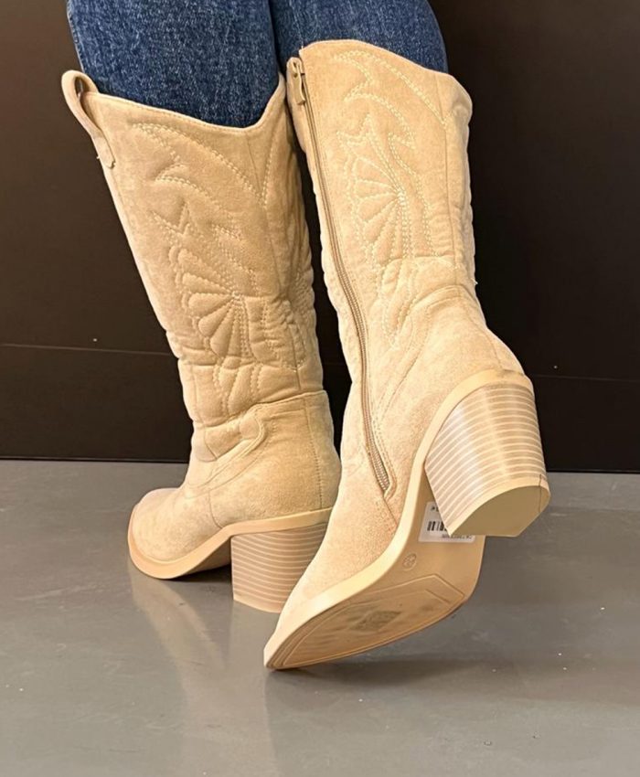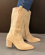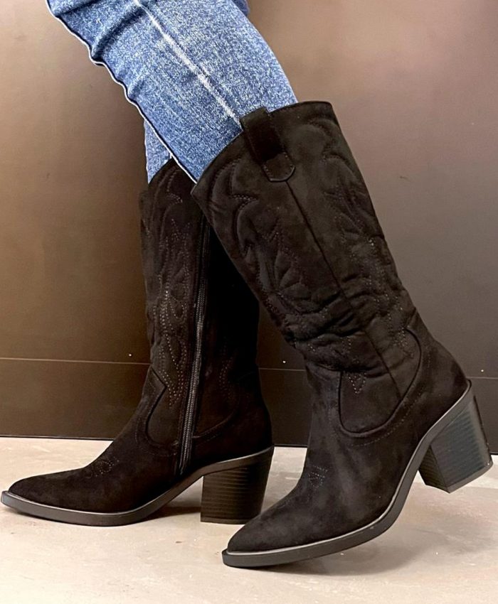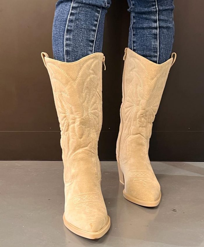 Añade un toque de sofisticación a tu estilo con nuestras botas cowboy de antelina, disponibles en colores clásicos negro y beige. Con un tacón de 6.5 cm y una caña de 32 cm, equilibran comodidad y tendencia.