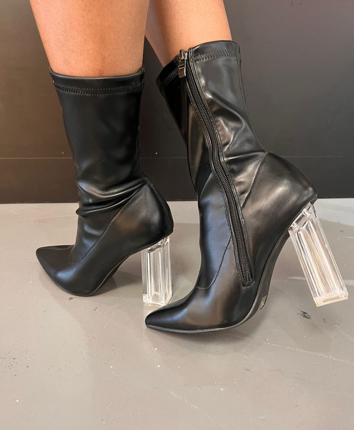 Estos botines son una pieza de declaración que combina funcionalidad con alta moda. El color negro clásico y la piel sintética de calidad se unen para crear un look que es tanto sofisticado como atrevido. El tacón de metacrilato transparente no solo es un punto focal llamativo, sino que también proporciona un soporte resistente y una altura envidiable. El cierre de cremallera añade un toque de practicidad, mientras que el diseño general del botín garantiza que puedas combinarlo sin esfuerzo con una variedad de estilos, desde lo casual hasta lo chic. Disponibles en tallas 37 a 40, estos botines son para los valientes, para aquellos que se atreven a destacar y caminar con confianza.
