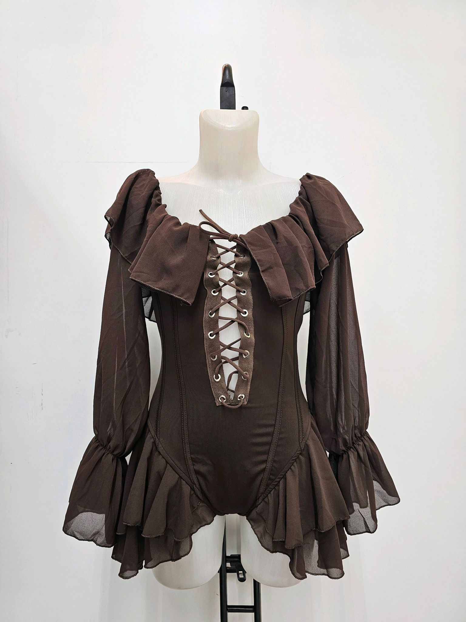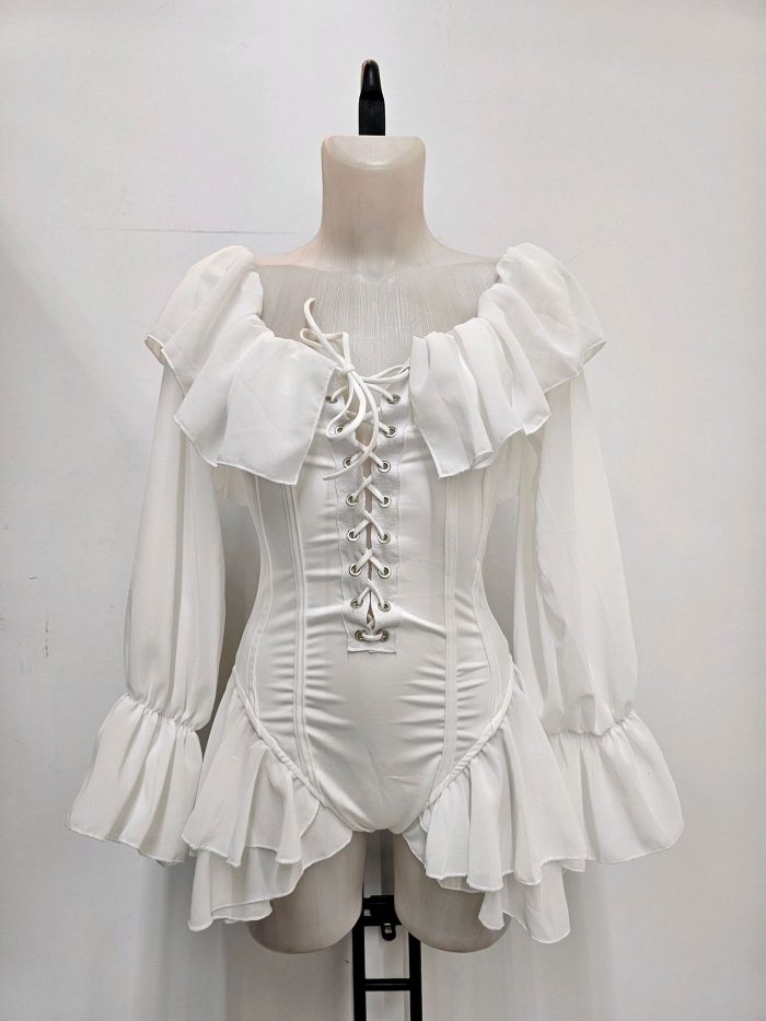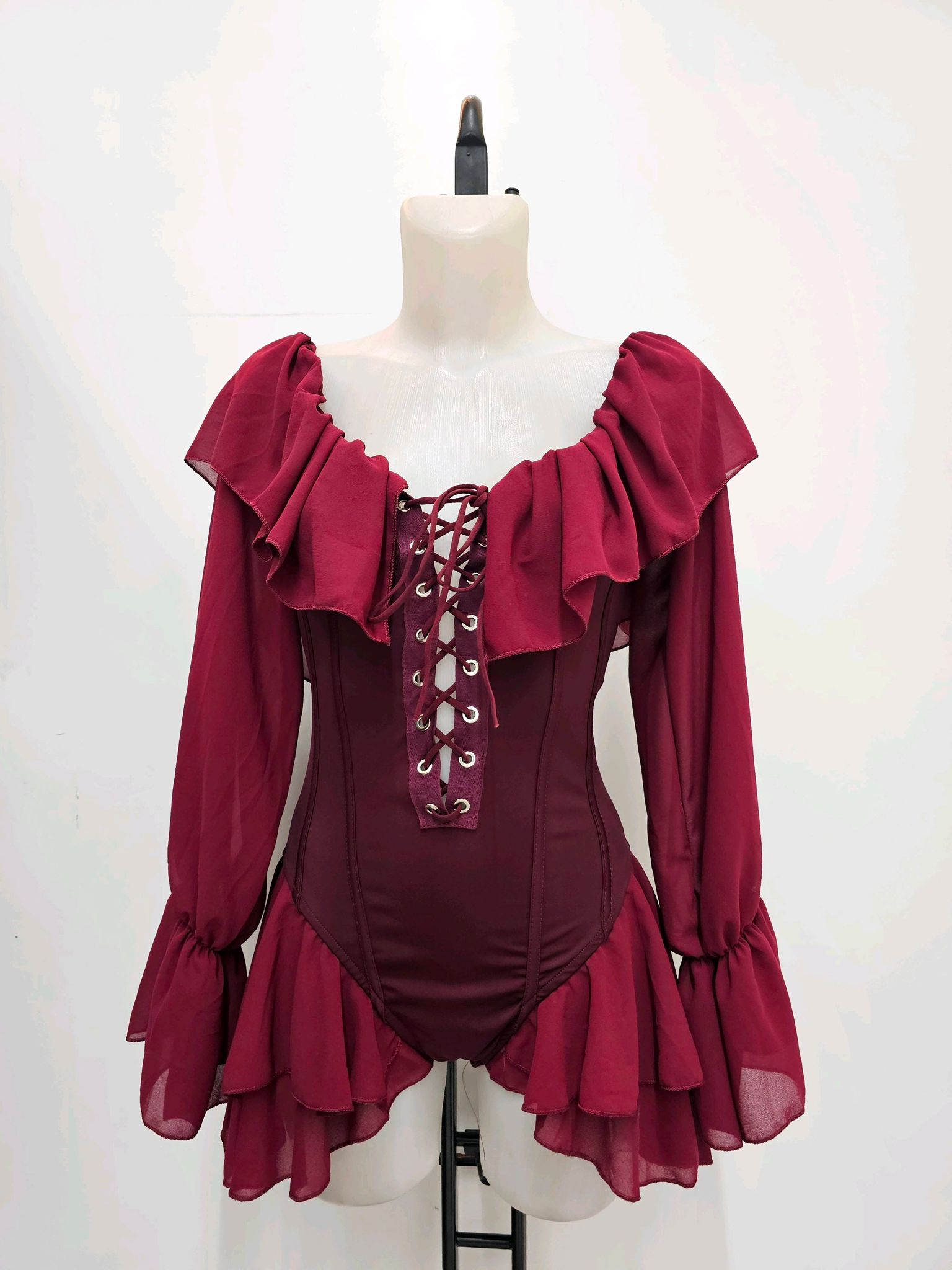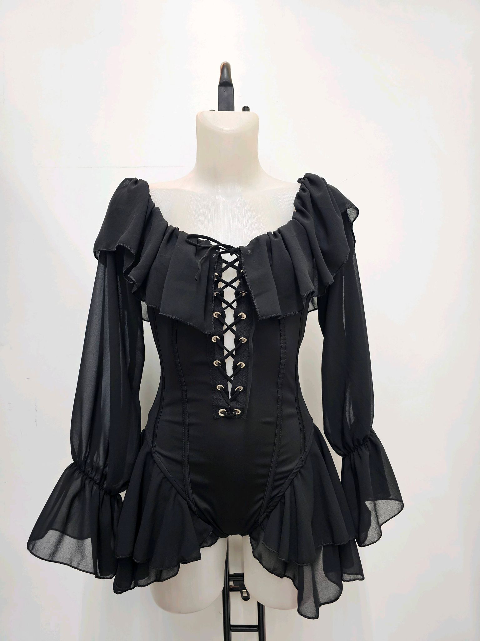 Este es un mono de manga larga y escote profundo con cordones frontales, confeccionado en un tejido ajustado que realza la figura. Su diseño incluye volantes amplios en los hombros y mangas acampanadas, aportando un aire dramático y elegante. La parte inferior es tipo body, lo que lo hace ideal para lucir con faldas, pantalones o solo como pieza protagonista.