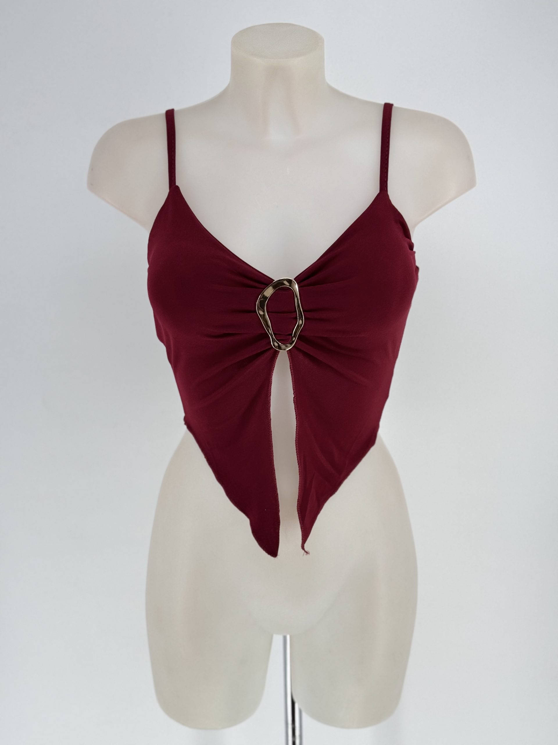 Top de tirantes finos con un diseño moderno y atrevido, ideal para destacar en cualquier ocasión. Confeccionado en un tejido suave y ligeramente elástico, su escote pronunciado está adornado con un detalle metálico dorado que aporta un toque elegante y distintivo. El corte en pico al frente estiliza la figura y crea un efecto visual favorecedor. Esta prenda combina perfectamente con jeans, faldas o pantalones de tiro alto para un look versátil que se adapta tanto al día como a la noche.