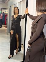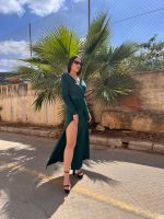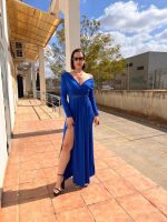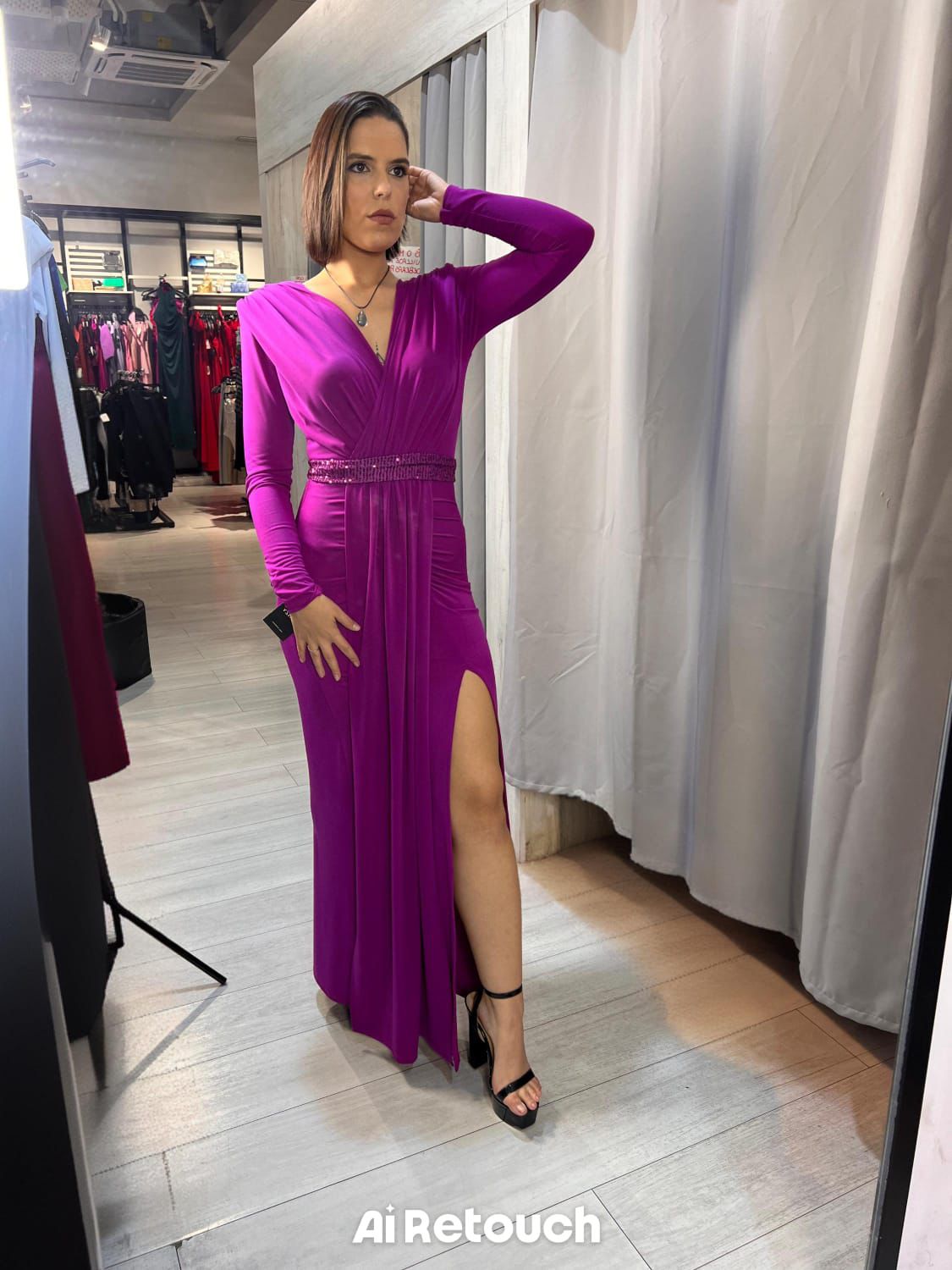 Elegante vestido largo de corte cruzado con escote en “V” y abertura delantera que aporta un toque sofisticado y sensual. Su tejido fluido y elástico se adapta cómodamente a diferentes siluetas, ya que es talla única.