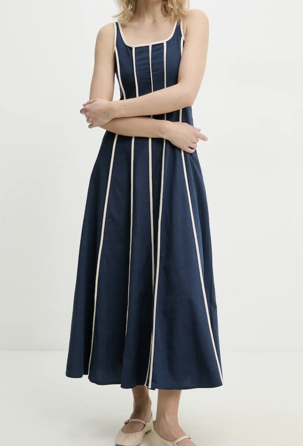 Este vestido es de corte midi con tirantes delgados y escote recto. El diseño es predominantemente azul marino con líneas verticales blancas que estilizan la figura. Las líneas están distribuidas de forma simétrica desde el busto hasta el dobladillo, lo que aporta un efecto alargador visualmente.