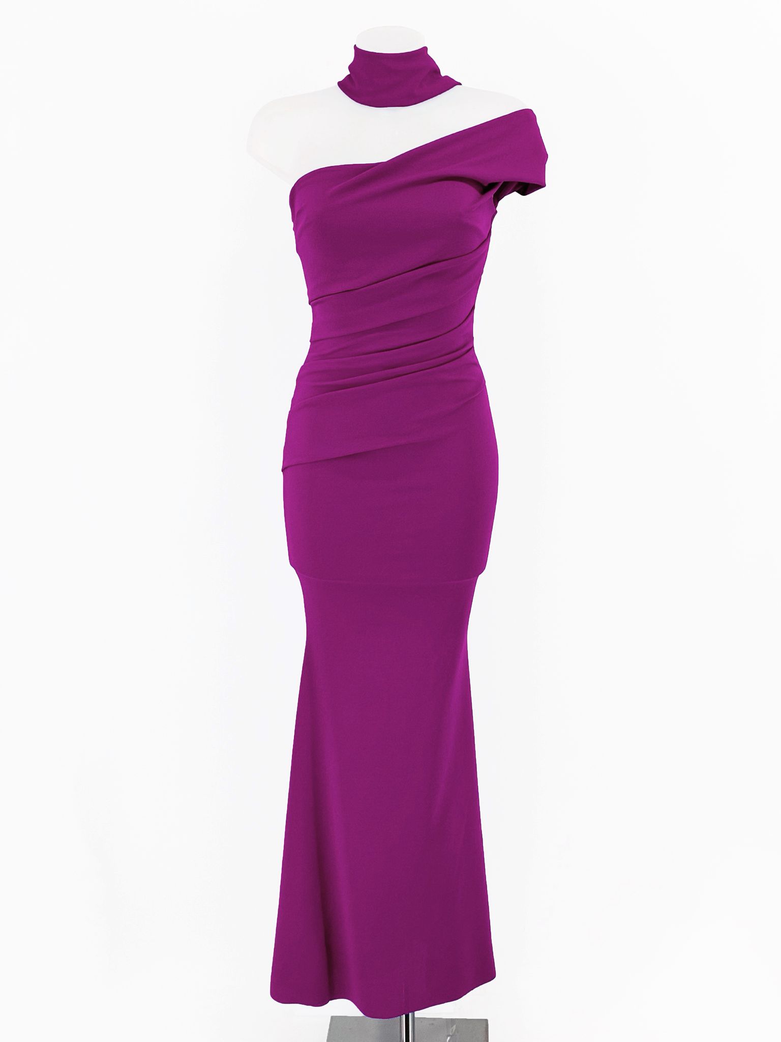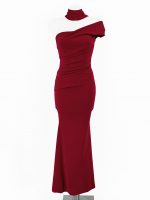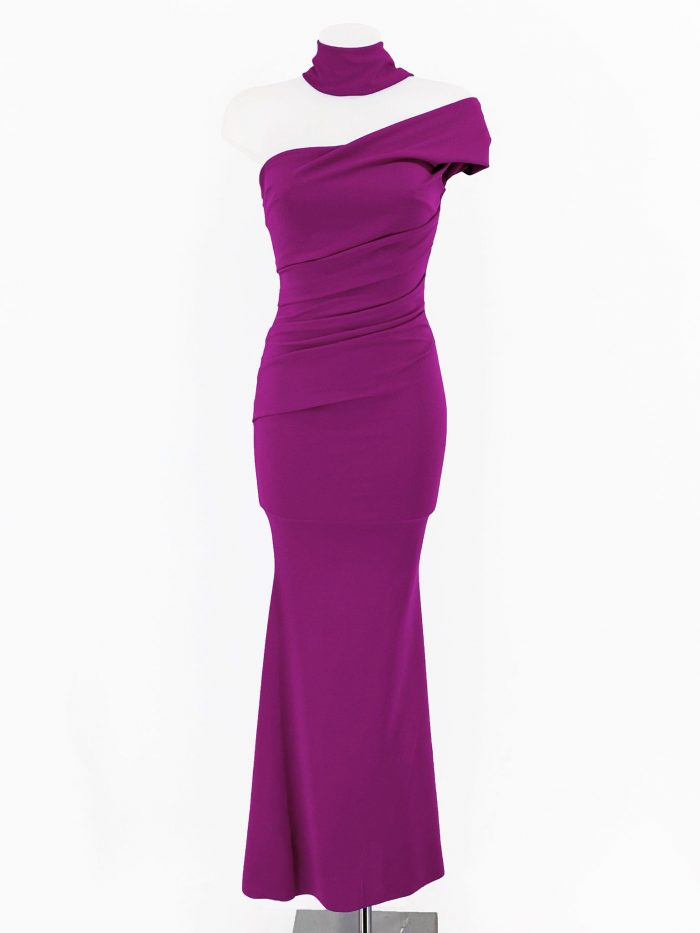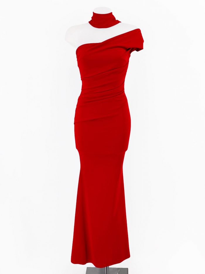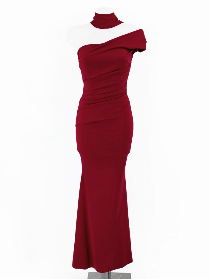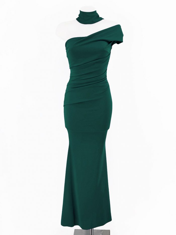 Este vestido largo de fiesta destaca por su diseño moderno, sofisticado y lleno de estilo. Presenta un escote asimétrico de un solo hombro con un elegante detalle de tirante cruzado en la espalda, que aporta un toque único y vanguardista.