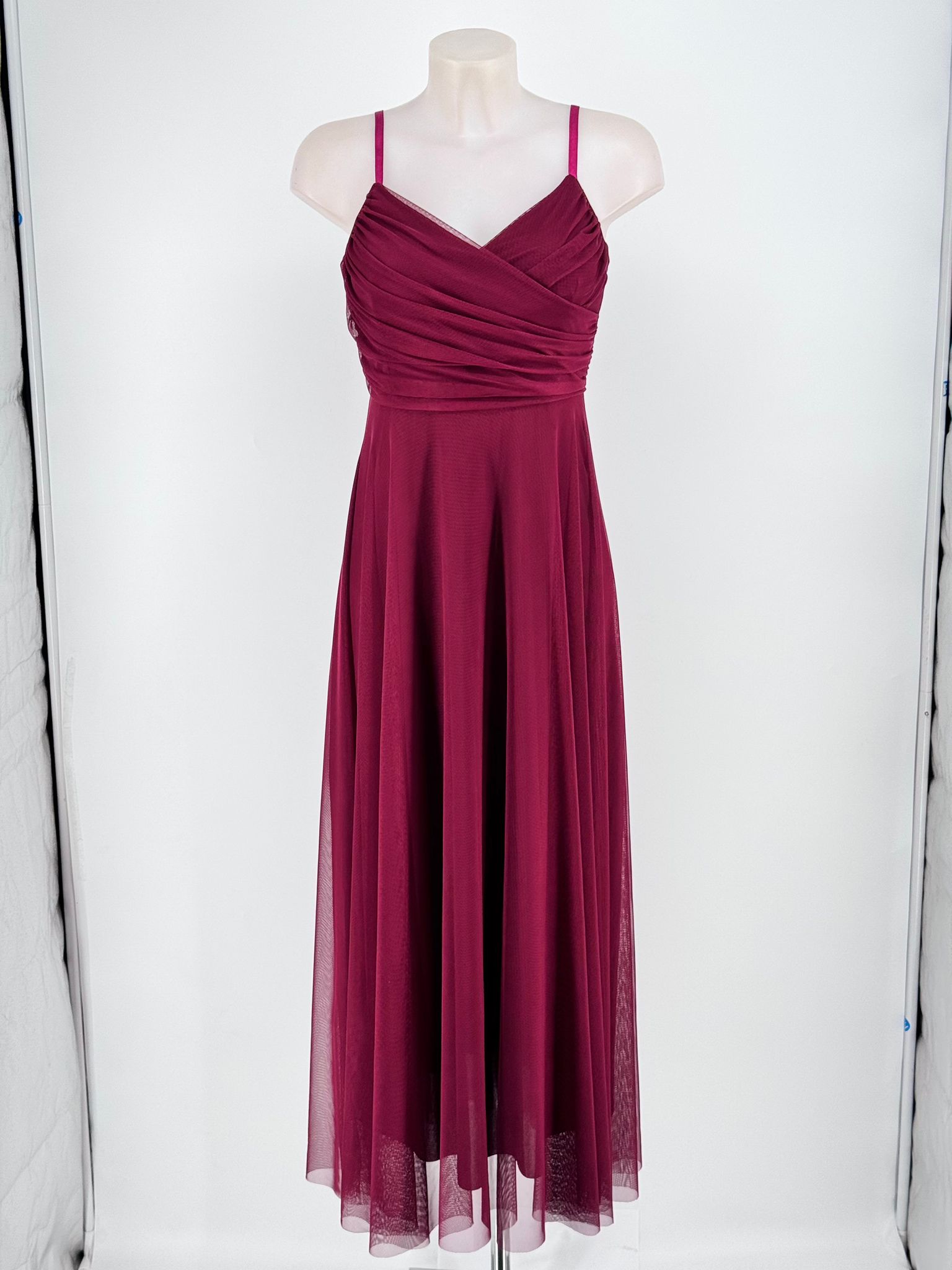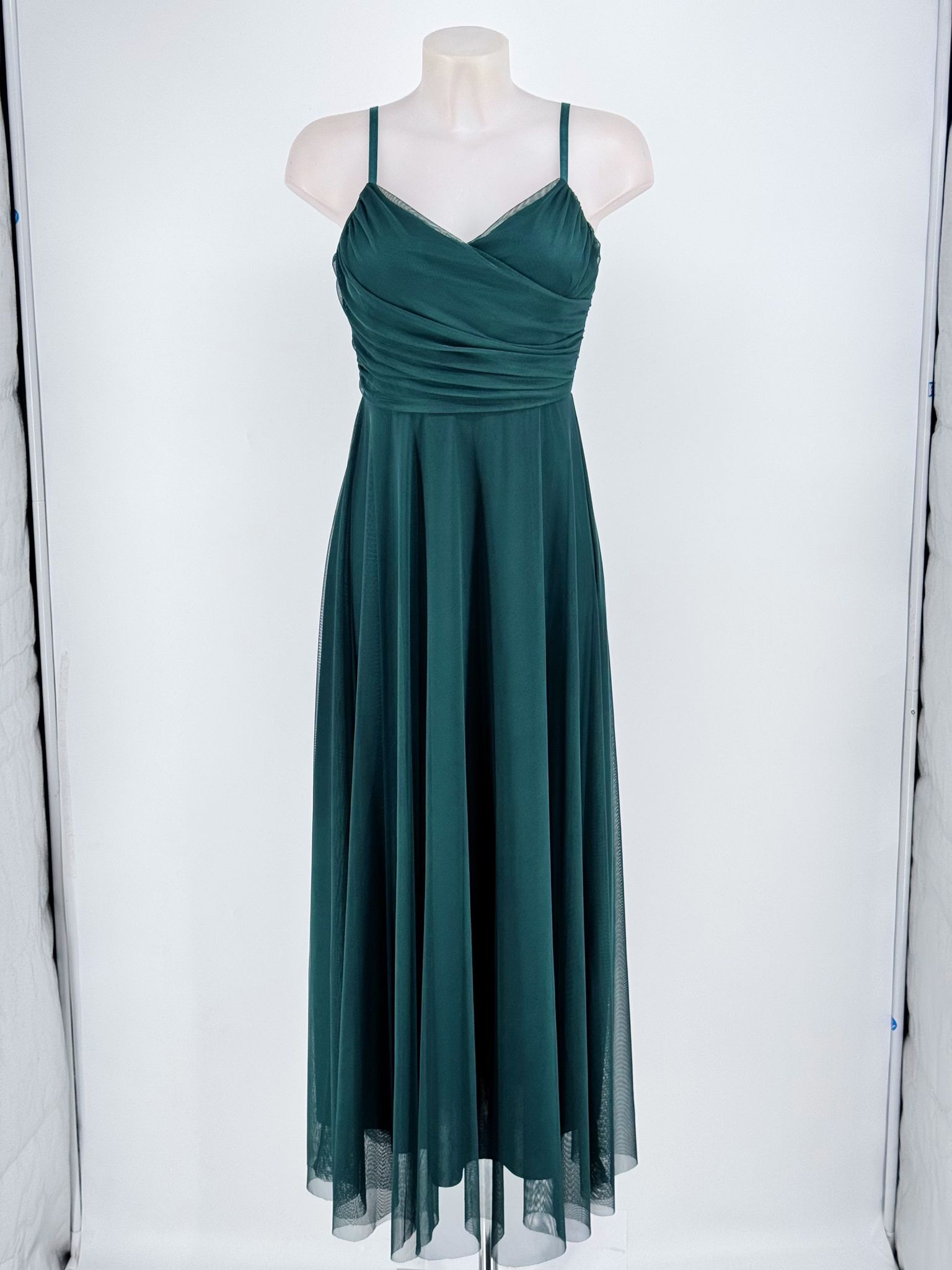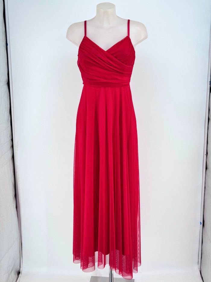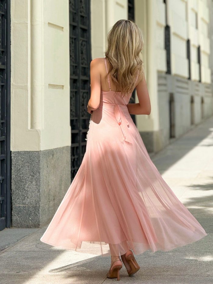 Este vestido largo está confeccionado en tul suave y ligero, lo que le da una apariencia etérea y romántica. Su diseño presenta un escote en V cruzado que alarga visualmente el cuello y estiliza el busto de forma natural.