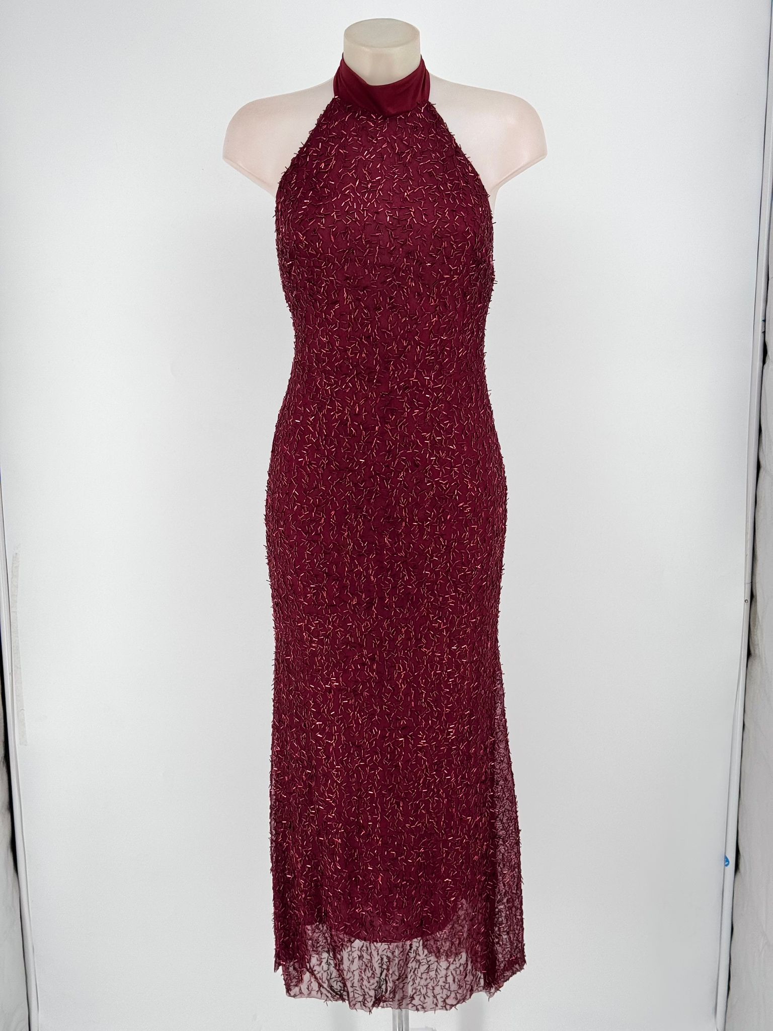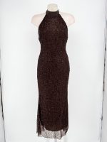– Su diseño con lentejuelas y cuello halter lo hace un vestido versátil.