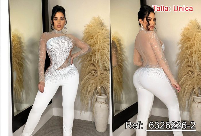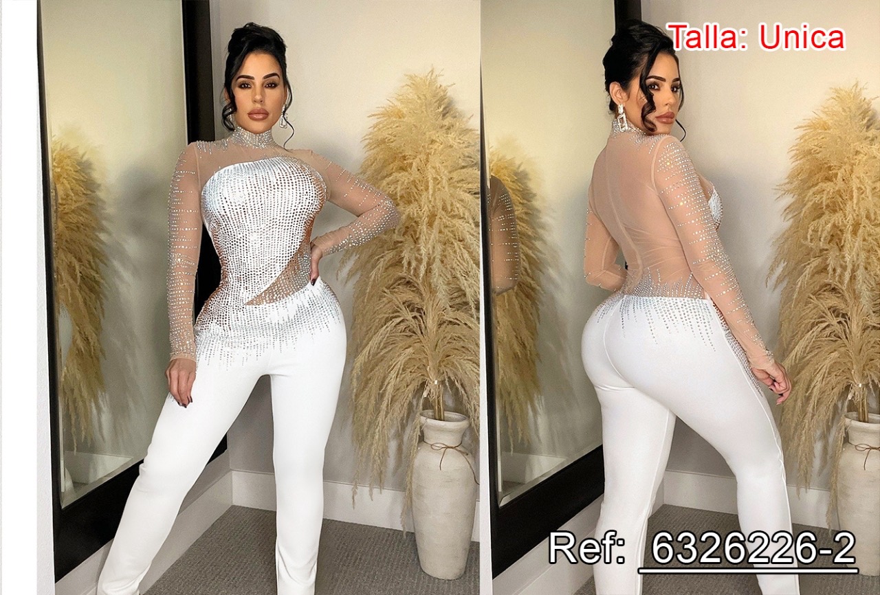 ¡Róbate todas las miradas con este espectacular jumpsuit blanco! Diseñado para destacar tu figura, este enterizo combina un pantalón ajustado con un top de malla transparente decorado con aplicaciones de pedrería brillante en toda la parte frontal y mangas. Su diseño moderno incluye cortes asimétricos y un efecto ilusión que aporta sensualidad sin perder elegancia. Es ideal para fiestas, eventos especiales o una noche de glamour. Disponible en talla única, con tela elástica que se adapta cómodamente a diferentes cuerpos.