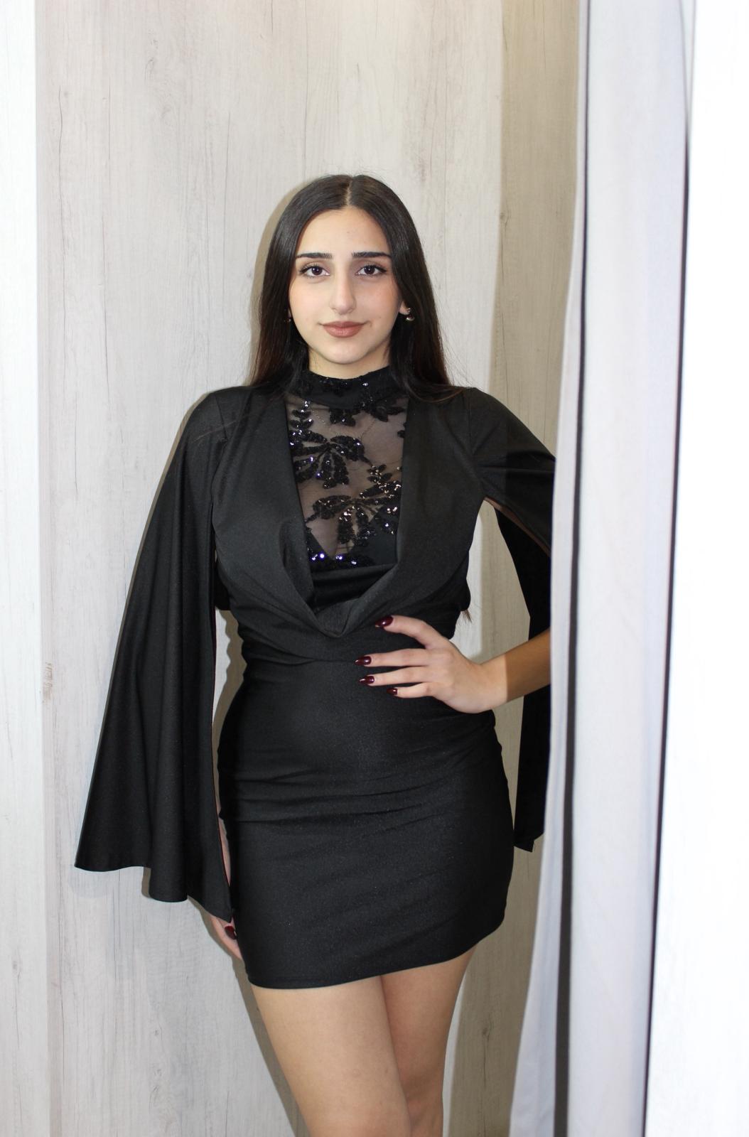 Vestido con dos formas de vestirse, con una capa o sin capa. El vestido sin capa es ideal para discoteca, salidas de fiesta tiene un escote en el pecho con un encaje floral.