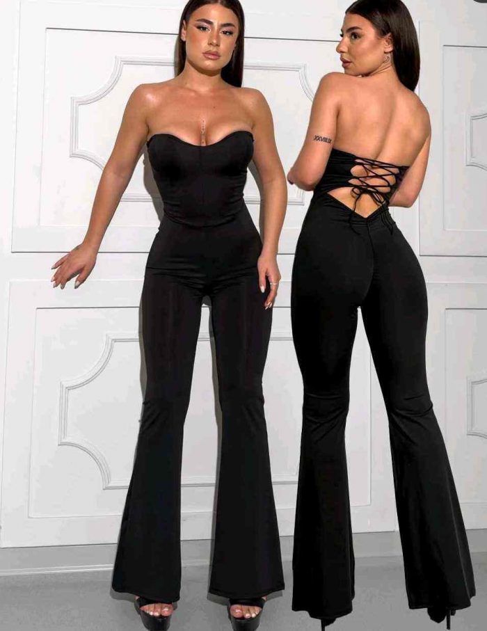 Impacta con este enterizo negro de diseño sofisticado y atrevido. Su escote en forma de corazón tipo strapless realza el busto, mientras que la espalda descubierta con tiras cruzadas estilo corset añade un toque sensual y moderno. La parte inferior con corte acampanado estiliza la figura y alarga visualmente las piernas. Confeccionado en tela elástica que se adapta al cuerpo como una segunda piel, es perfecto para noches especiales, cenas o salidas con estilo. Disponible en talla única, cómoda y favorecedora.