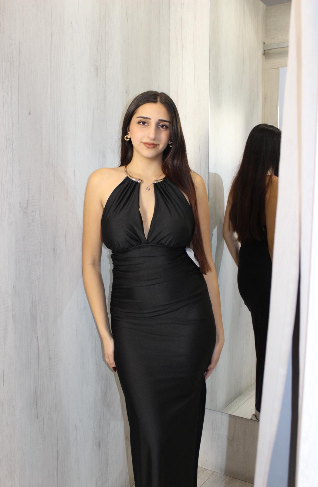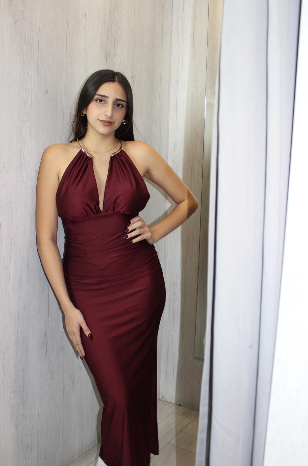 Vestido largo de saten con un aro en el cuello y un escote en el pecho ideal para fiestas de navidad, nochebuena, salidas de fiesta. Es talla unica y disponible en tres colores en marron, burdeos y negro.
