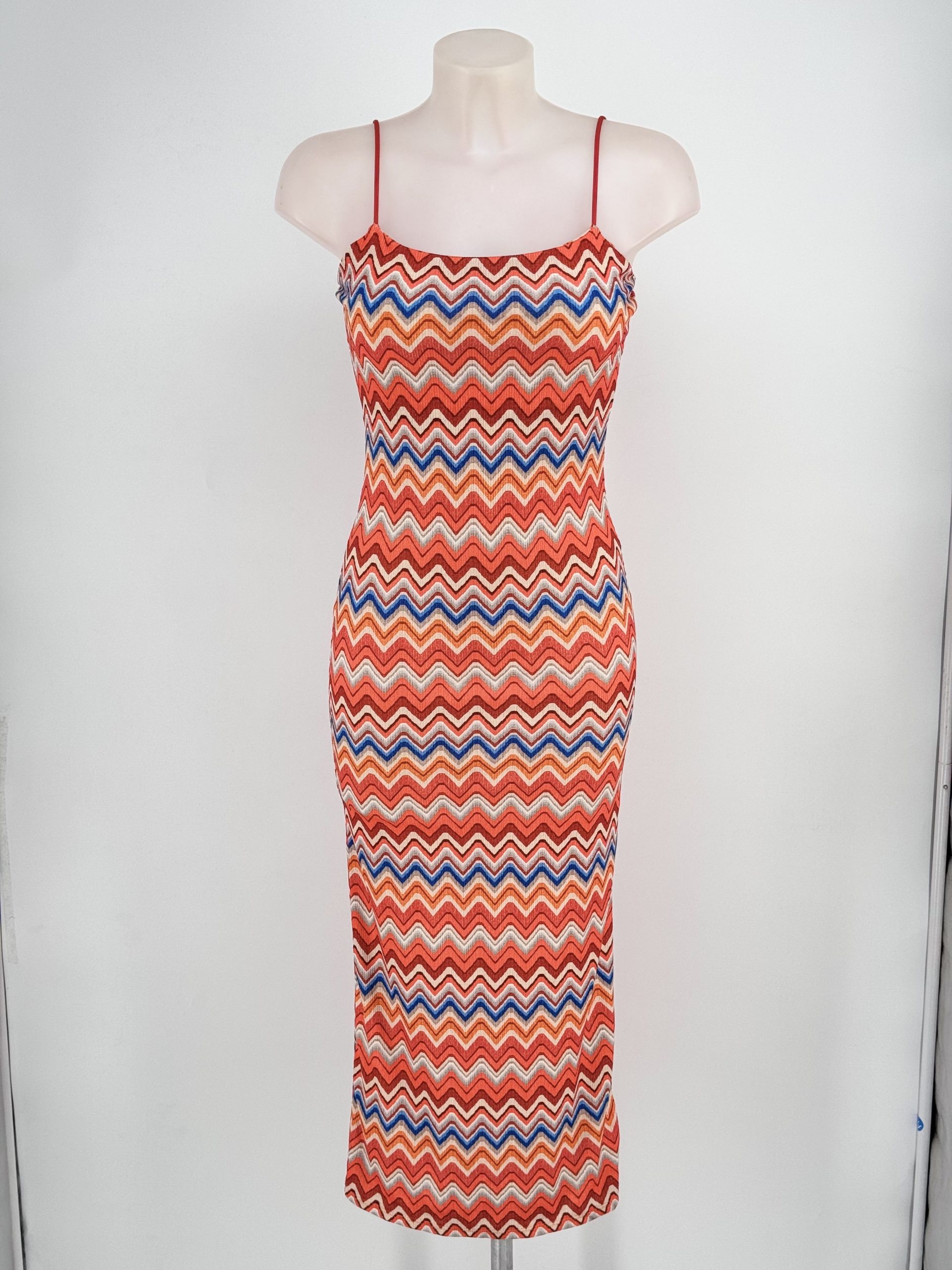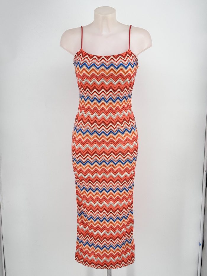 Este modelo de vestido es un diseño ceñido al cuerpo de corte midi, confeccionado en un tejido de punto con textura acanalada. La característica principal del vestido es su estampado de rayas en zigzag, que crea un efecto visual dinámico y moderno. Cada versión del modelo se presenta en diferentes combinaciones de colores, manteniendo siempre el mismo patrón geométrico: una en tonos tierra como marrón, mostaza, burdeos y blanco, ideal para looks otoñales o eventos en tonos cálidos y sobrios, con tirantes finos marrones que complementan la paleta; otra en tonos vibrantes como rojo, naranja, azul y blanco, perfecta para el verano o eventos casuales y festivos, con tirantes finos rojos que armonizan con el diseño dominante; y una tercera versión en colores frescos como turquesa, burdeos, mostaza claro y blanco, ideal para primavera o eventos diurnos, con tirantes finos en color menta que resaltan el tono turquesa del patrón. El vestido presenta escote recto con tirantes espagueti que aportan un toque delicado y femenino. Gracias a su tejido elástico, el modelo se adapta perfectamente a la silueta, realzando la figura de manera elegante. Es una prenda versátil que puede combinarse tanto con sandalias de tacón para un look más sofisticado como con zapatillas para un estilo casual chic.